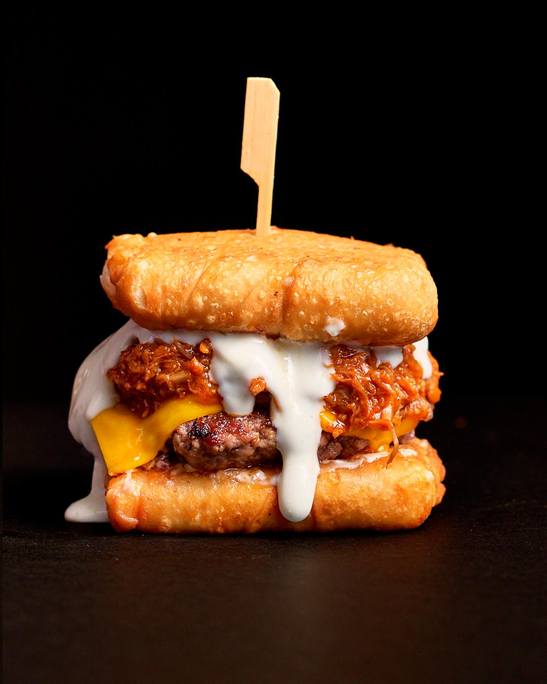 Roastbeef con queso americano, pulled de cerdo en salsa barbacoa.