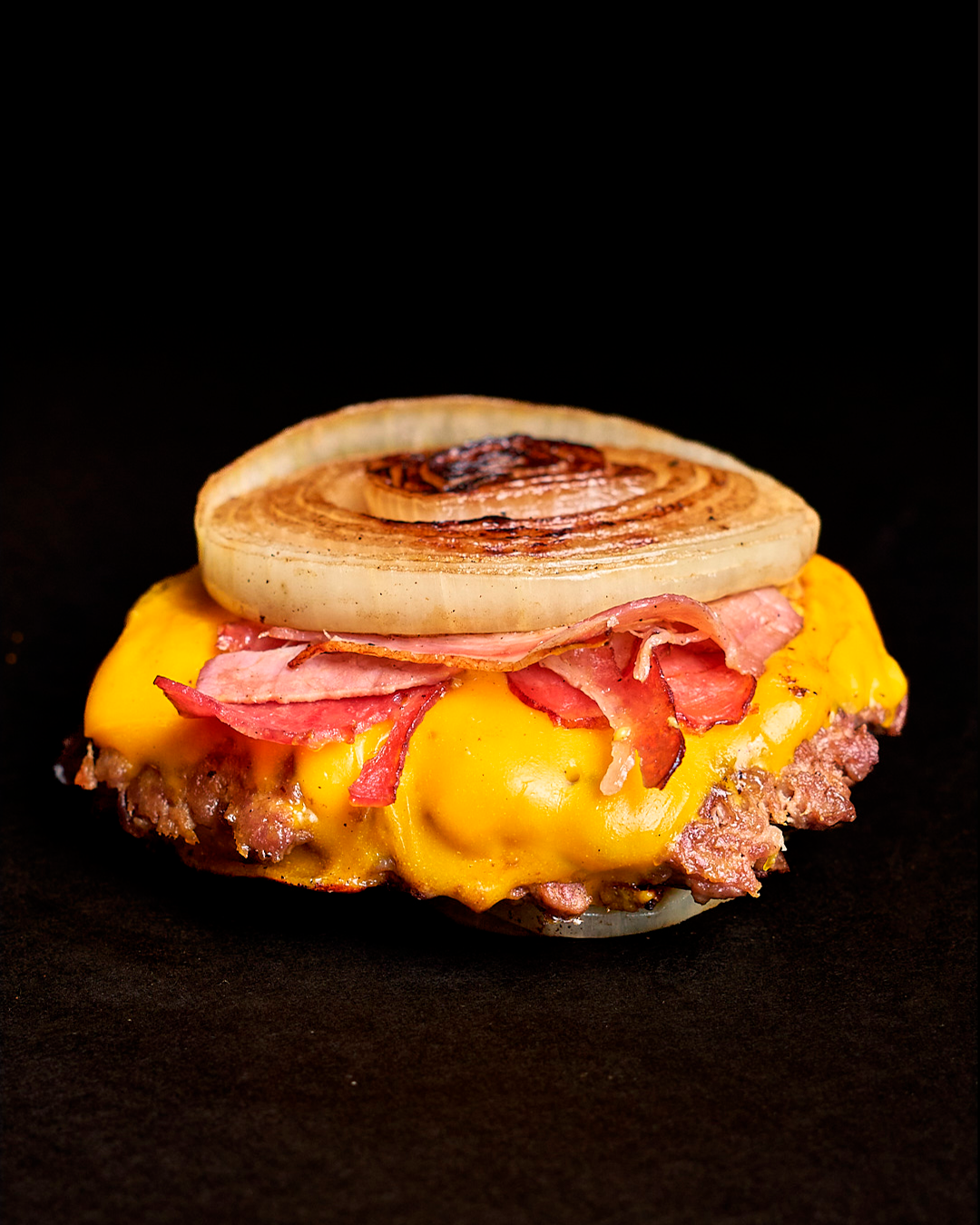 Doble carne smash, triple queso americano, panceta y dos medallones de cebolla como pan. Incluye salsa “In N Out” + Papas fritas