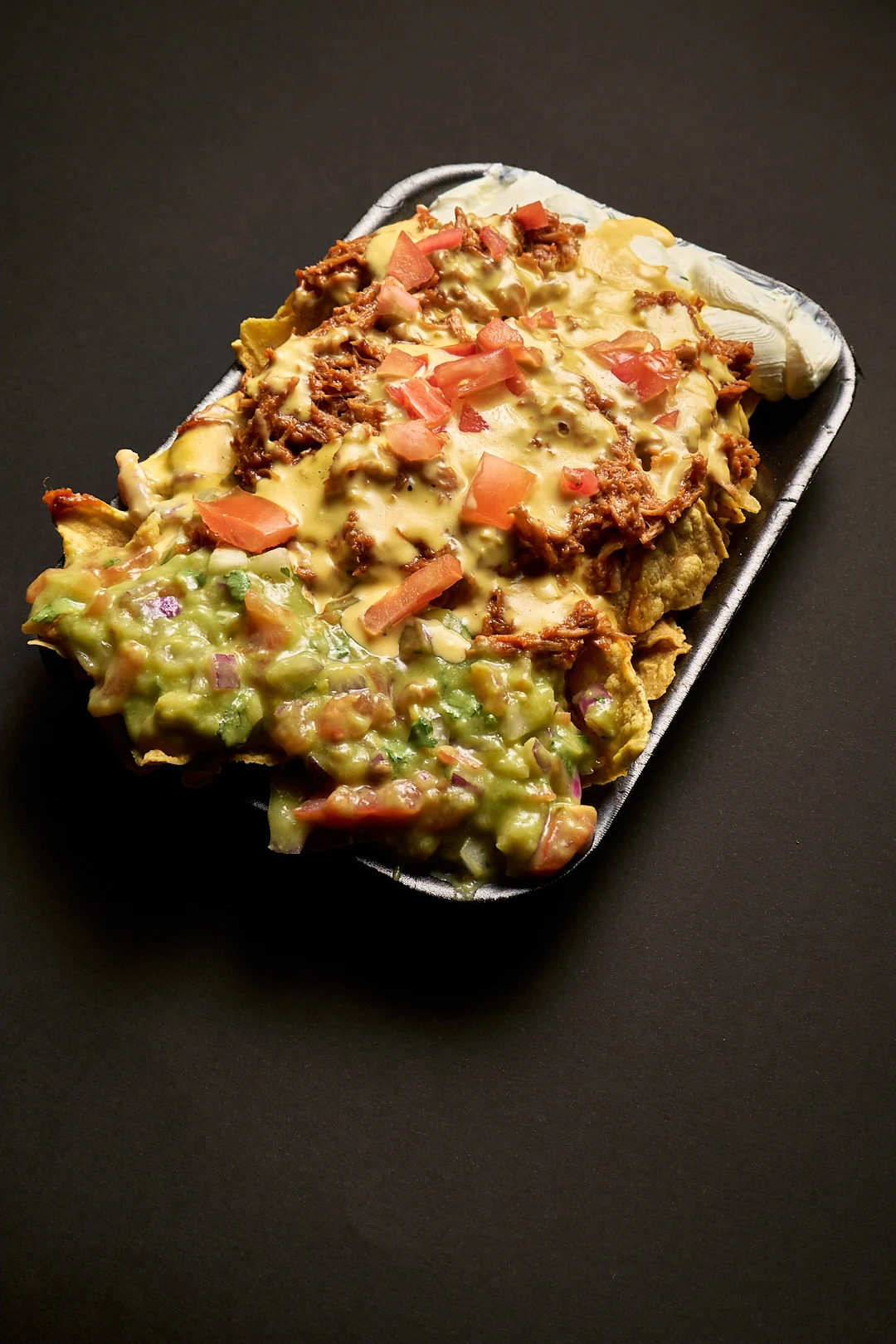 Montaña de nachos servidos con queso cheddar, pulled de cerdo en salsa barbacoa, guacamole casero, queso con hierbas y tomate recién cortado, opción picante con jalapenos.