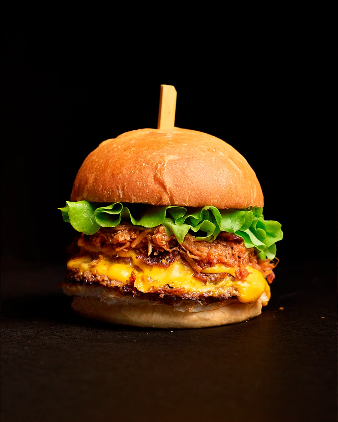 Carne de roastbeef rellena con cebolla grillada, pulled de cerdo en salsa barbacoa harlem, queso americano, lechuga y cebolla crocante. Todo en pan de papa casero + Papas fritas