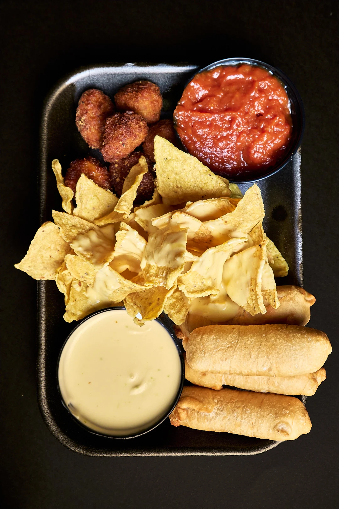 Incluye 4 tequeños, 8 chicken balls, nachos con cheddar, un dip de salsa alioli y 1 dip de ketchup HARLEM