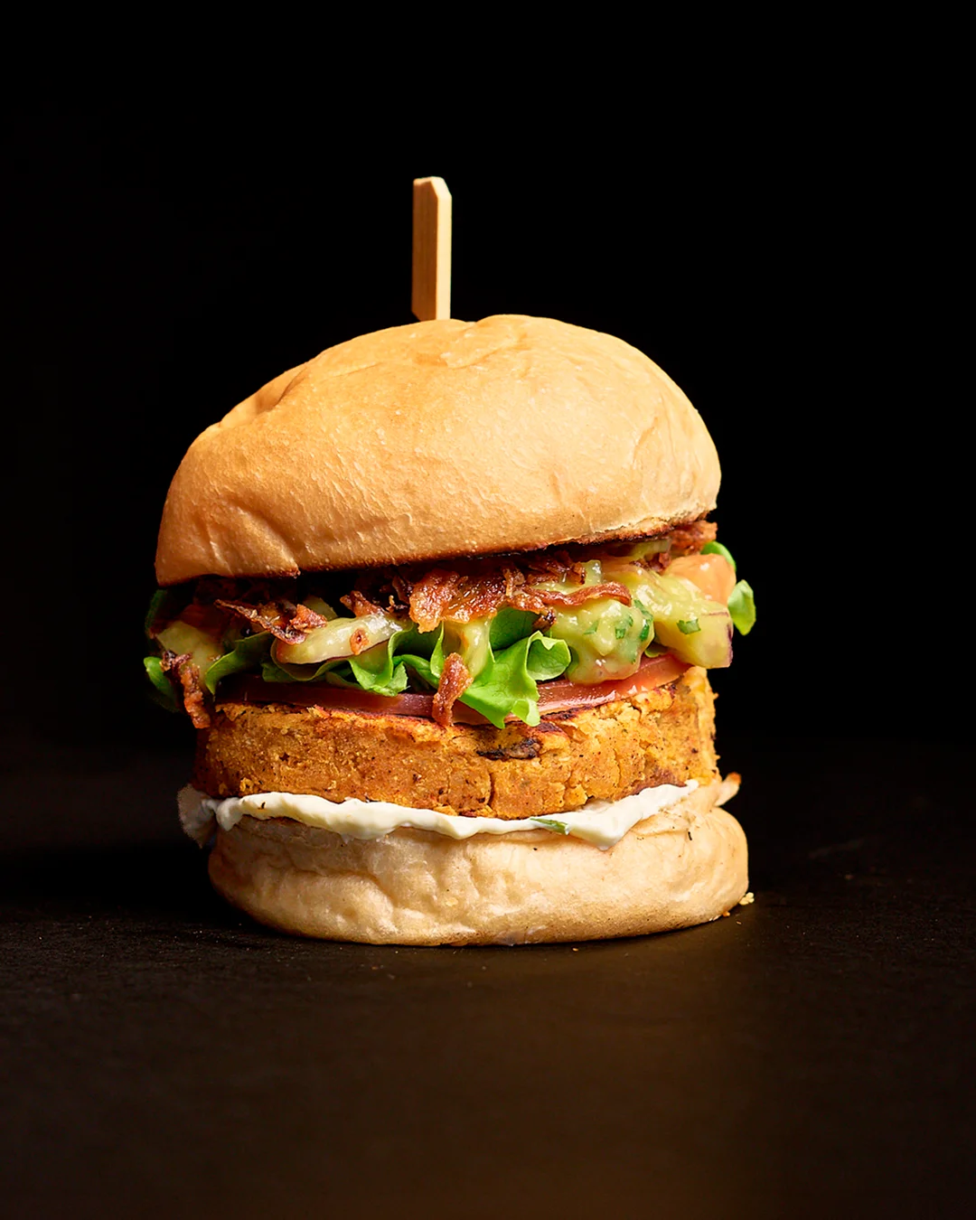 Hamburguesa de garbanzos con tomate, lechuga, cebolla crujiente, guacamole y queso con hierbas. En pan de papa casero + Papas fritas